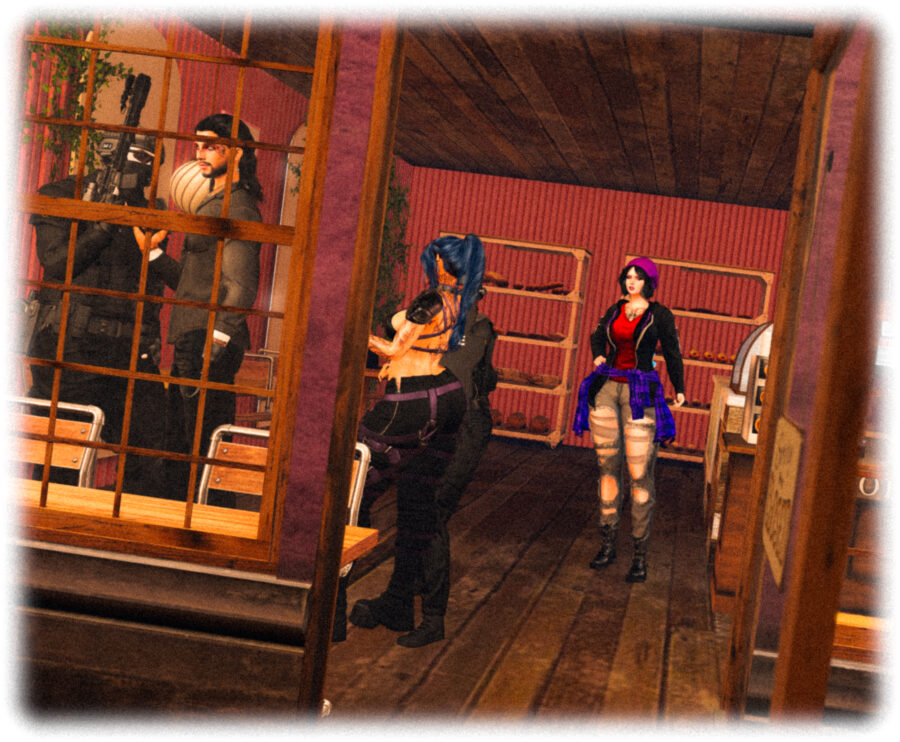From my position, (The Observer newspaper dispenser acting as cover!) the muffled thunder of gunfire erupted once more, this time punctuated by the crash of furniture and shouts of officers. It’s not clear what they’re saying, but one officer was seen bracing herself against the door, some type of assault rifle pressed against her shoulder before shooting! She’s unleashed two sharp shots toward one of the attackers, it looks like Ash, a shape I’ve scene but rarely interacted with around town. I could be wrong, so we’ll have to wait for better angles or other witnesses to confirm, as I must admit I don’t even know some of the officers involved! I thought I heard her shout “Ash!” when this officer gave a command to lower weapons!