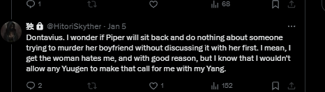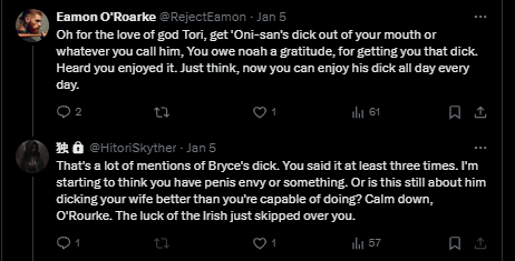 Tori: “As for Bryce being my brother? He’s not. Far fucking from it. But Bryce did had a sister, one who was Japanese as Bryce was adopted. When he betrayed me in the worst way he knew how, I brought up his sister. Pointed out how she died and what he was doing to me. The Rejects seem to have heard him and I call each other Onii-san and Imoto. But they are too dim-witted to understand that they aren’t terms of endearment. They are reminders of pain and betrayal. Neither Bryce nor I will allow each other to forget what we put each other through. Despite that we stopped fighting because there seemed to be no end in sight and we were both exhausted, the names are meant to remind each other of the pain we can inflict on each other if we decide to war again.”