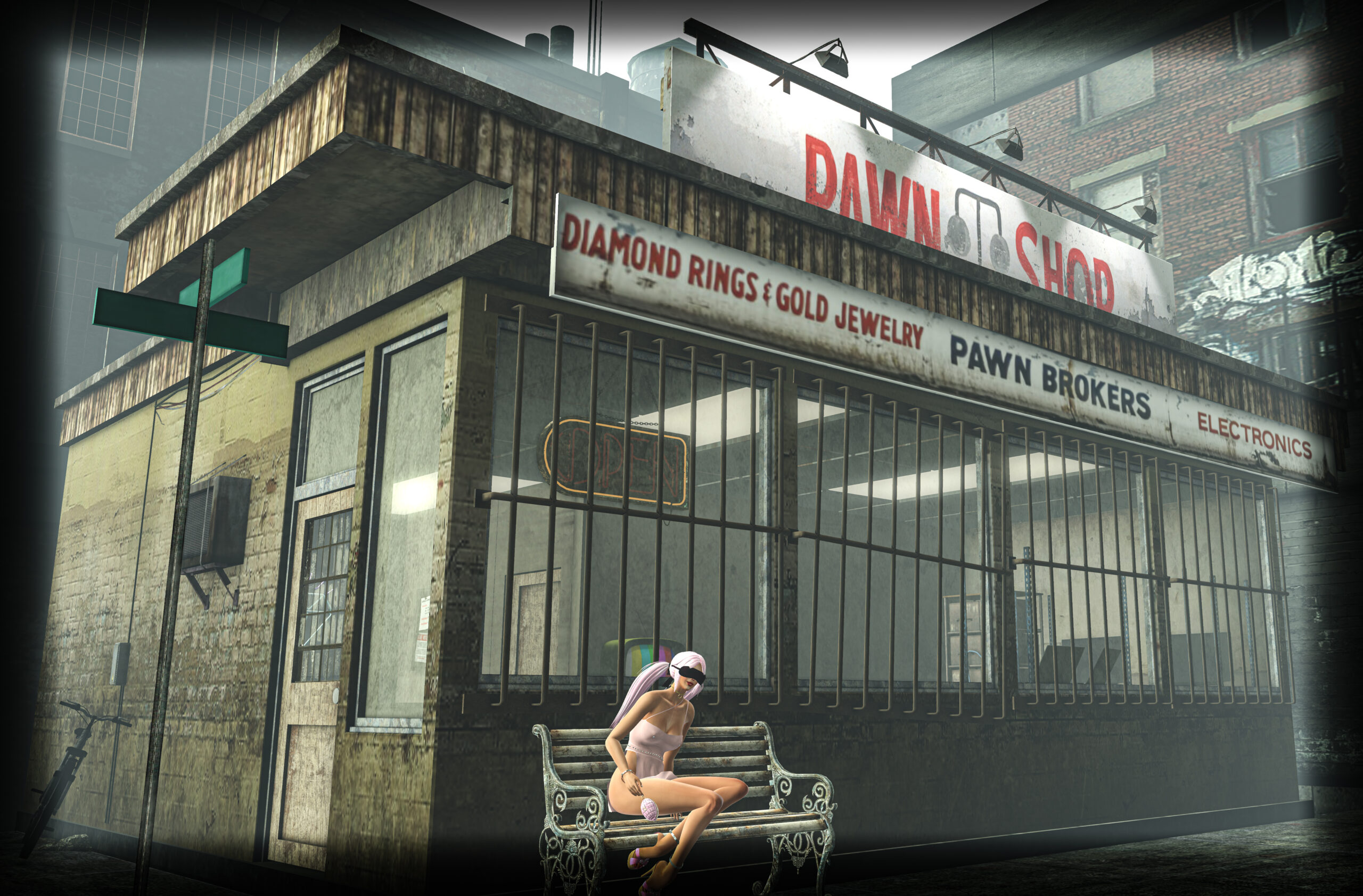 I first parked Sandy outside the Pawn Shop which has recently been featured for a raid by the HPD where the ‘Vipers’ were dismantled. On the basis most inside the shop was quiet we had no problems setting Sandy down on the bench to pose.