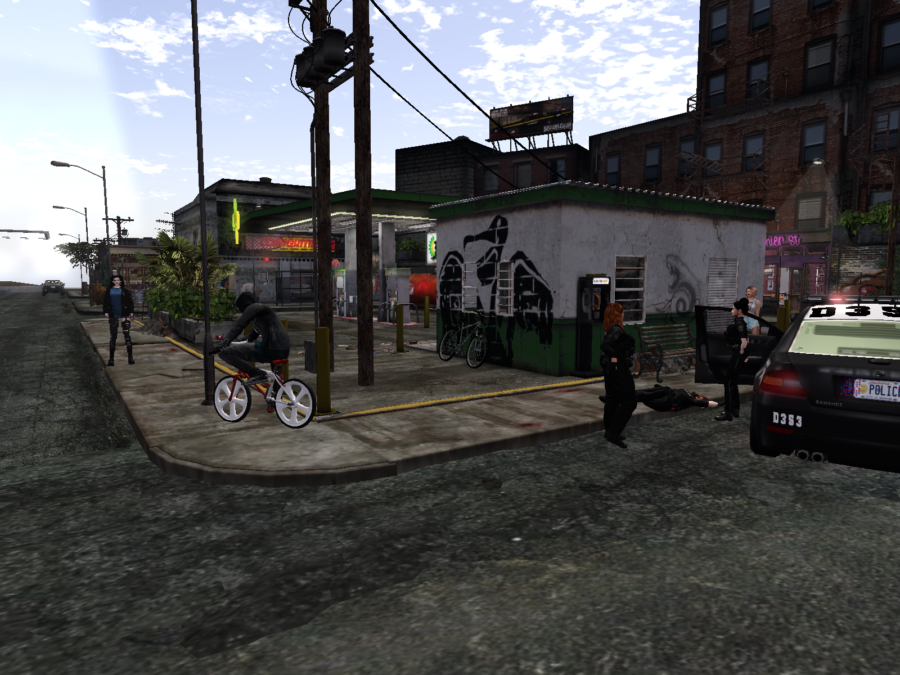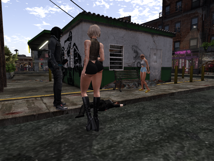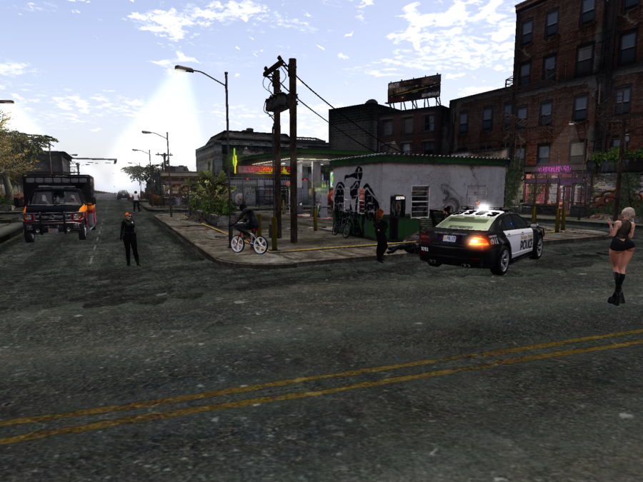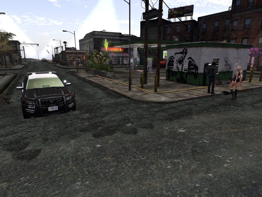But my profound ponderings were, as Hathian would have it fated, rudely interrupted. Across the street, behind the aromatic embrace of the gas station, lay a sight: a police officer, horizontal. Perhaps ‘contemplating the clouds‘, but seemingly in that twisted manner to indicate it wasn’t voluntary. Hovering nearby like vultures near a fresh kill were three figures: one man, two ladies – one of whom was rocking a fetching pair of police-issue handcuffs. The fellow, bold as brass, was casually clutching what looked suspiciously like the officer’s radio, probably already calculating its eBay value. My inner paparazzi screamed, ‘Action!‘ So, naturally, I watched, listened, and my camera started working overtime.