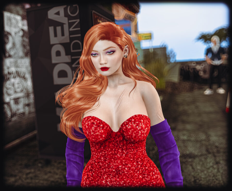 Jessica Rabbit floated up like a cartoon fever dream scarlet sequins poured over a body-curve of a gown, thigh-high slit threatening to split the night in two, purple opera gloves tracing slow lines as she posed. A tumble of glossy red waves, a half-lidded look, and that hip-cocked, heel-click prowl turned the street outside the store into a potential crowd of accomplices (if she just but asked). Glamour weaponized…
