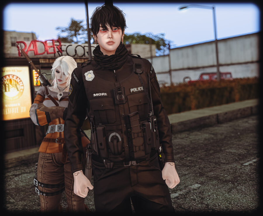 Then there was Ciri of Cintra, who was going quite undercover. I didn’t recognise her… But she had a white wig pinned back, scar tracks, a blade at the hip; posture like a drawn bow. She didn’t smile… apparently destiny rarely does… In this image she had taken refuge (weirdly for Ciri) behind a Balrog of Morgoth. Or rather an HPD officer with a cute tattoo… ‘Memento Mori’…